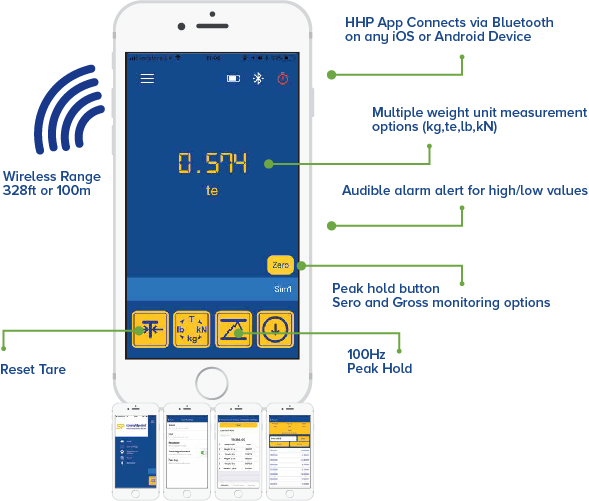 The Bluetooth signal effortlessly connects to any iOS or Android smartphone that has our free HHP app installed, providing the operator with a wireless range of up to 328ft or 100m. This allows them to stand in a safe position from the load, with no requirement to read a load on the load cell itself. The app will also allow the operator to log data versus time, or on events such as over or underload. An adjustable alarm will alert the operator on their smartphone if any overload is occurring.
