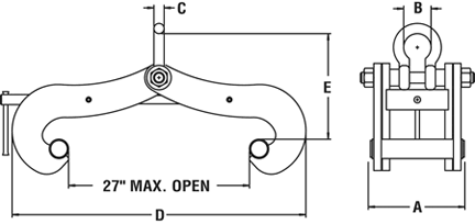 Model Number | Rated Capacity (tons) | Flange Width Min. - Max. (in.) | Max. Flange Thickness (in.) | A (in.) | B (in.) | C (in.) | D Min. - Max. (in.) | E Min. - Max. (in.) | Weight (lbs.) | ||