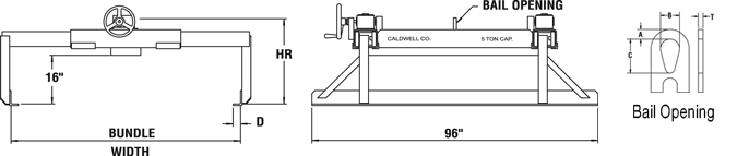 Model Number | Capacity (tons) | Min. Bundle Width (in.) | Max. Bundle Width (in.) | HR (in.) | D (in.) | Min. Aisle (in.) | A (in.) | B (in.) | C (in.) | T (in.) | Weight (lbs.) |