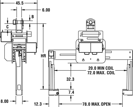 Model Number | Capacity (tons) | Min Coil Width (in.) | Max Coil Width (in.) | HR (in.) | Throat (in.) | B (in.) | C (in.) | Weight (lbs) |