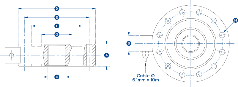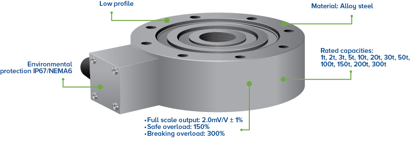 Frequently used for applications such as bolt tension monitoring, SPMT module weighing and OEM applications the SP pancake loadcell has rated capacities covering 1t to 300t with a safe overload of 150% and an ultimate strength of 300%.