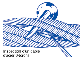 Pour inspecter l’âme des câbles à 6 ou 8torons il faut complètement décharger le câble. Insérez prudemment une pointe à travers un ou deux torons et tournez la pointe dans la direction du câblage. Si l’âme est fortement lubrifiée vous aurez besoin d’une bonne illumination pour voir les fils cassés! Vous pourriez aussi utiliser un fusil à air comprimé pour enlever l’excès de lubrifiant sur le câble, assurez-vous de bien relubrifier l’âme après l’inspection.