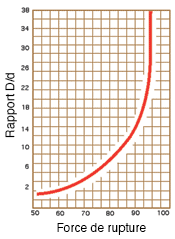 Perte de résistance sur poulies ou axesLa force de rupture d’un câble est déterminée au moyen d’un test standard. Par le montage d’accessoires à l’extrémité du câble , et par une traction linéaire du câble. Toutefois lorsque le câble chemine sur une surface courbée ( comme une poulie ou un axe) sa résistance en sera diminuée. L’importance de cette diminution dépendra de la sévérité de la courbure tel que décrit par le ratio D/d. Par exemple, un câble courbe autour d’un axe de diamètre identique a son propre diamètre n’atteindra que 50 % de sa force telle qu’indiquée pendant le test standard. C’est ce qu’on appelle « efficacité de 50 % ». Même si on considère un ratio D/d de 40, il y aura une perte allant jusqu’à 5 %. Lorsque les ratios D/d diminuent, la perte de résistance s’accroît rapidement. L’angle de courbure ne doit pas être de 180°, de 90° ou même de 45°; des angles de courbure relativement faibles peuvent entraîner des pertes considérables. Le tableau présenté est élaboré a partir de données de test standard telles que publiées par le « Wire Rope Technical Board », est base seulement et est une moyenne pondérée de 458 tests avec axes et cosses pour des câbles de classe 6×19 et 6×37. |