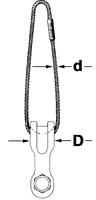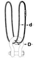 Le rapport D/d est le diamètre autour duquel l’élingue est recourbée divisé par le diamètre du corps de l’élingue. Exemple: Un câble métallique de 1/2 po de diamètre est recourbé autour d’un tuyau de 10 po de diamètre ; le rapport D/d est donc 10 po divisé par 1/2 po, soit un rapport D/d de 20:1. Ce rapport a un effet sur la capacité nominale des élingues. |
