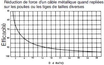 ![]() Lorsqu’un câble métallique est enroulé autour d’une poulie ou d’un autre objet, on constate une perte de la résistance due à la courbure. Alors que le rapport D/d diminue, cette perte de résistance augmente et le câble perd de son efficacité. Cette courbe illustre l’efficacité du diamètre d’un câble à différents rapports D/d. Cette courbe est basée sur des charges statiques et s’applique à des câbles métalliques à 6 brins de classes 6 x 19 et 6 x 37. |