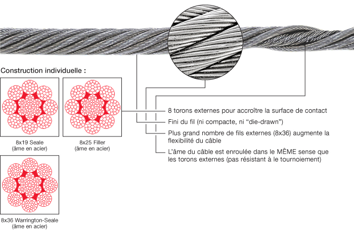 8×19 Seale, 8×25 Filler, 8×36 WS, IWRC, torons régulièrs