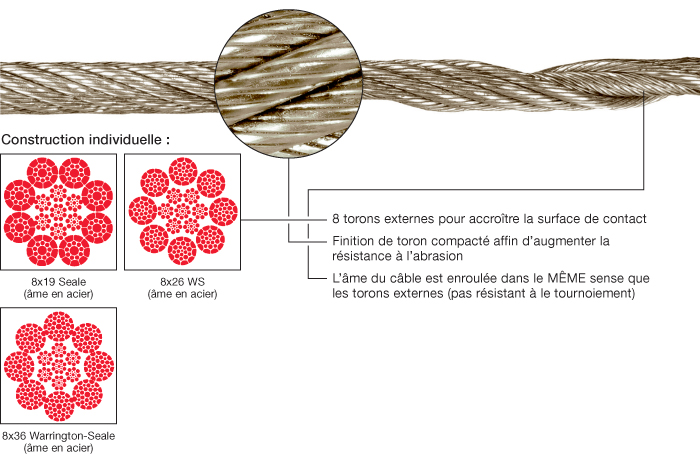 Toutes les constructions à 8 torons exigent des dimensions appropriées de poulies et de tambours. Des poulies sous-dimensionnées et/ou usées vont immédiatement causer des déformations de câbles, des ondulations, ou des torons élevés. Ces câbles demandent beaucoup de soin durant l’installation (pas de bobinage à courbure inversée).