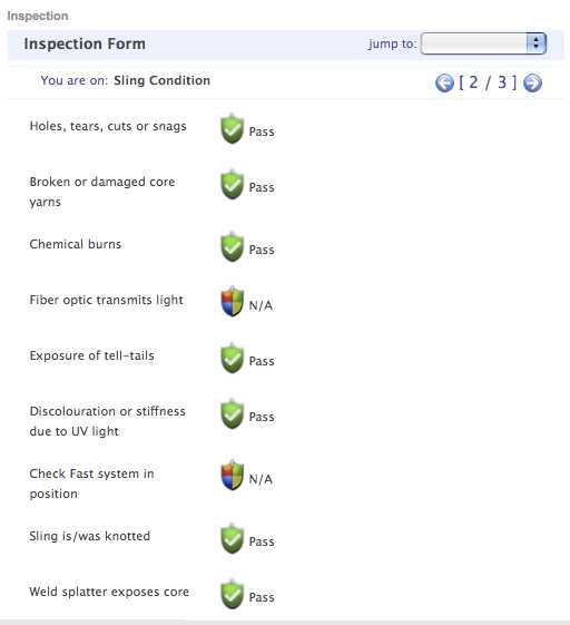 Ceci est un des trois écrans (selon le produit) qui vous permettent de réaliser une inspection conformément aux critères ASME B30.9 (incluant toutes les exigences connues découlant des lois provinciales canadiennes). Tous les points d’inspection sont énumérés et l’utilisateur doit maintenant, ou ne pas confirmer, la condition de chaque partie ou détail de l’élingue.