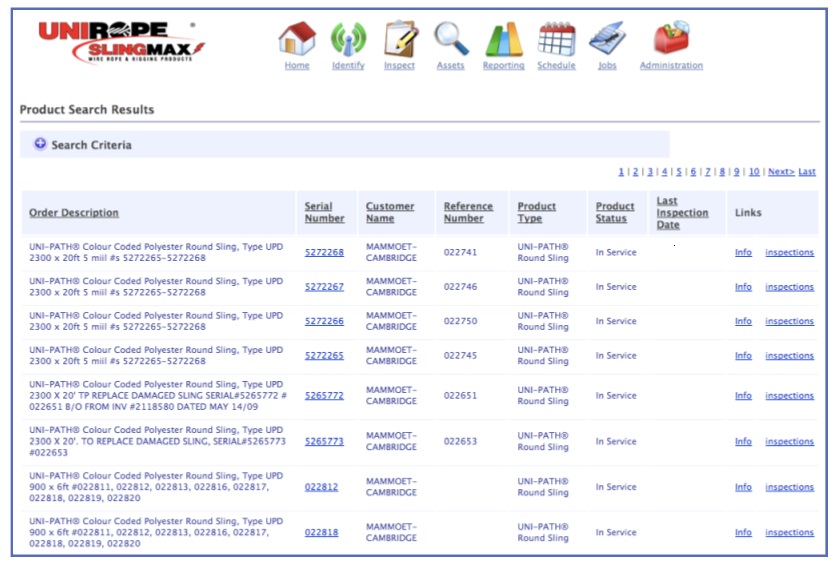 Lorsque vous êtes connecté, vous pouvez faire une recherche sur nombre de critères. Si vous avez utilisé un lecteur RFID, celui-ci vous dirigera directement à votre produit de levage spécifique. Si vous n’utilisez pas un lecteur, vous pouvez faire une recherche par numéro d’identification d’élingue, numéro de série, numéro d’identification de la dernière inspection, type de produit, etc.
