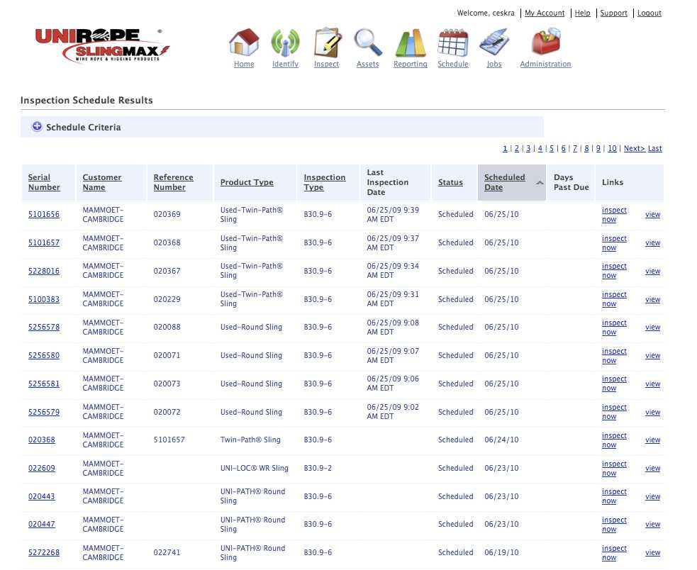 Lorsque vous avez trouvé la pièce d’équipement que vous cherchiez, cet écran fournit tous ses renseignements détaillés comme la charge d’utilisation, la charge d’essai, et l’information concernant la sécurité. Si vous avez besoin de plus amples informations, un clic vous amènera à notre site Web. Si vous désirez télécharger notre certificat original de manufacturier, eh bien, vous en êtes aussi à un clic. Cet écran vous permet de voir toutes les inspections, les réparations et les essais de tension de vos élingues ou de vos équipements de levage. Plus encore, vous pouvez maintenant voir et établir votre échéancier d’inspection.