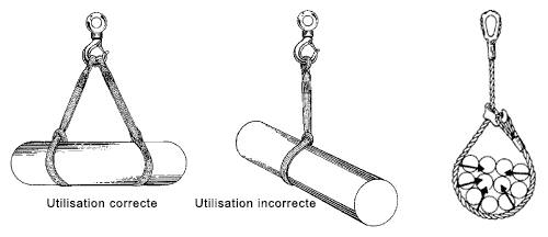 L’élingue devrait être installée d’une manière qui permet un contrôle approprié de la charge. Il est dangereux d’utiliser une seule élingue pour lever une charge qui tend à se déplacer et à se libérer. Soyez certain de lever à partir du centre de gravité. Élevez la charge avec prudence. Si la charge n’est pas balancée, abaissez la et corrigez la position de l’élingue jusqu’à ce que le point d’équilibre soit obtenu. Soyez sûr de tenir compte de l’angle élingue – charge et d’utiliser une protection contre l’abrasion et les bords tranchants pouréviter que l’élingue ne soit coupée. Des attelages par collier étrangleur standards compressent la charge sur 3 côtés seulement. |