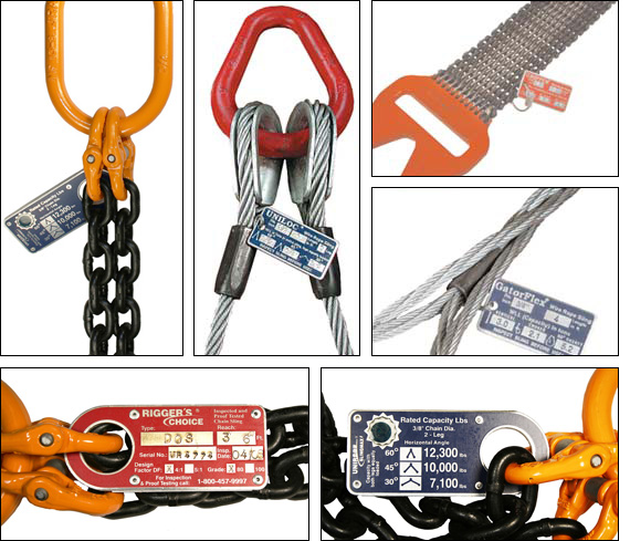 Unirope went through the expense to develop a sling tagging system which lasts. The aluminum tags are made from super sturdy 1/8" thick aluminum plate; in the case of our chain tags two of them are riveted together to form a 1/4" thick sturdy tag with a pull-off strength exceeding 2,000 lbs. All information is deep etched and/or deep impression stamped into the tag. For most chain- and wire rope sizes the capacity information is already etched in with large legible numbers so users can actually read the tag from about 6 ft away. That in itself is a huge step forward in plant and construction site safety.