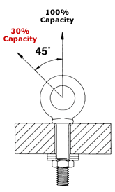 We recommend that eye bolts only be used at a horizontal angle greater than 45°. Sling strength at 45° is 71% of vertical sling capacity. Eye bolt strength at 45° horizontal angle drops down to 30% of vertical lifting capacity. |