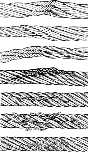 - Distortion: Kinking, crushing, birdcaging, or other damage which distorts the rope structure. The main thing to look for are wires or strands that are pushed out of their original position in the rope. Slight bends in a rope where wires or strands are relatively in their original position would not be considered serious damage. But good judgment is indicated.