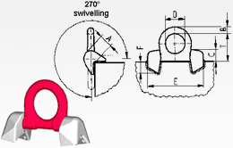 Eye Plate for Corners VRBKAn enhancement of the well-established RBK-series with an over 30% increment of the WLL. A forged ring bracket according to EN1677-1. Even force distribution owing to the two point attachment. Low profile, since it can be folded within an angle range of 270°. The welding block for edges is forged out of a good welding material 1.0577+N (St 52-3) and clearly stamped with an identification number for the permissible WLL. |