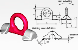 Eye Plate, ready for welding VRBSAn enhancement of the well established RBS series with an up to 30% increment of the WLL. The two points of attachment facilitate an even and optimal force distribution into the work piece, thus usage of thinner base plates is possible. A forged, pink coated ring bracket according to EN1677-1. The welding block is forged out of a good welding material 1.0577+N (St 52-3). Low profile, high dynamic, and static strength. The ring is stowable, thus avoiding the hazard of tripping. |