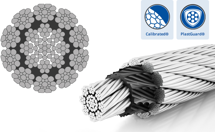 The core is plastic coated to prevent metal to metal contact between inner- and outer strands and greatly reduces internal, undetectable, wear and abrasion. Also, the core is twisted in the opposite direction of the outer strands making this rope spin-resistant and therefore ideal for cranes where both rope ends are attached to the drum.