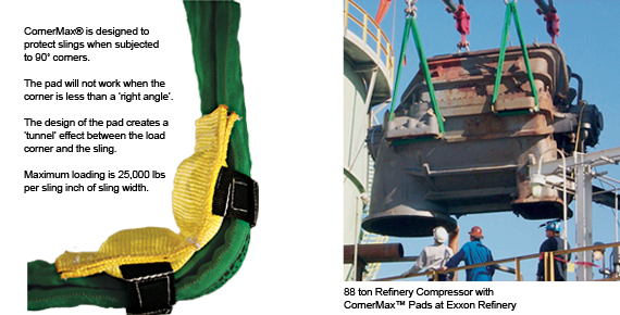 CornerMax™ Pad Our ‘CornerMax™’ wear pad was developed for the toughest and most demanding lifting jobs using Twin-Path® Slings. We tested this pad to withstand a ‘very’ sharp corner to about 25,000 lbs per inch of sling width. Mind you, everything can be cut given enough pressure and force. But this pad is the ultimate development in synthetic sling protection. Easily attached with Velcro straps. Ask for a demonstration.