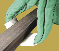 The CornerMax™ Sleeve is the latest in rigging protection from SLINGMAX® Rigging Solutions. The CornerMax™ Sleeve is the ideal solution to protect synthetic slings from cutting when it is not practical to use a CornerMax™ Pad (due to curvature of the load edge). Independent field and laboratory testing has shown the CornerMax™ Sleeve to be extremely cut resistant. The CornerMax™ Sleeve is made from Dyneema® Fiber. To prevent sliding, the 6˝ wide CornerMax™ Sleeve has been sewn down the middle (5˝) on each end of the Twin-Path® Extra Sling (pictured). The true benefits of this revolutionary material far outweigh the costs and now provide for the use of synthetic slings in applications previously dominated by heavy chain, mesh and wire rope slings. Maximum loading is 25,000 lbs per sling inch of sling width. |