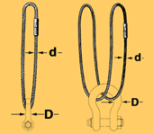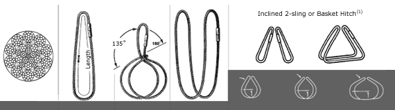 Warning: All Capacities and WLLs shown meet the specification of the Wire Rope Technical Board. All Capacities and WLLs are based on a pin or object diameter which has at least 5 times the diameter of the sling body. When a matching capacity round body shackle is used the D/d ratio becomes 2:1 or less. Depending on actual D/d ratio the sling capacity must be reduced by 35% to 45%! |