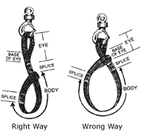 The Sling should be of sufficient length to assure that the choke action is on the sling body – never on the sling splice, fittings, eye or at the base of the sling eye or fitting. |