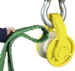 The Synthetic Equalizer Block is used to maintain tension on all legs of the sling during a lift. Rather than adjusting slings and hooks prior to completing a lift, the Synthetic Equalizer Block will automatically adjust itself when load is put on the device from the sling. This product was designed specifically for Twin-Path® slings and is the only rolling block for synthetic roundslings.