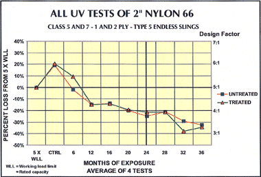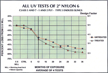 However, it must be noted that, although Polyester webbing seems less affected, even polyester slings will undergo a significant strength loss leading to a DECREASE in strength. Consequently, the DESIGN FACTOR for such slings will DROP from a 5:1 value to at least a value of 4:1!