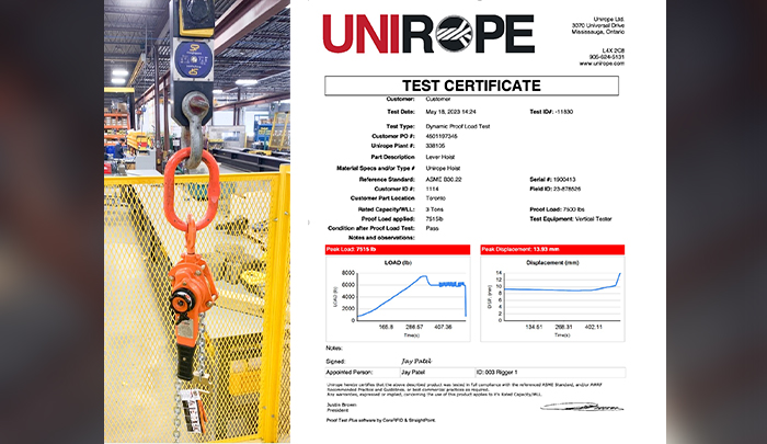 What is a ‘dynamic’ proof test? This is when the hoist is not only loaded once to a proof load (usually between 100% and 120% of Rated Hoist Capacity) but chain travel during this test should result in at least a minimum of one full rotation of the chain sprocket. This is required to verify that the hoist brake is working properly with no apparent slippage or load creep and holding the load by stopping the motion of the hoist handle or hand chain. This requirement is published by the AWRF Recommended Guideline for Proof Test Procedures for Manual Lever- and Manual Overhead and Electric Hoists. Make sure your Test Certificate shows not only the LOAD but also DISPLACEMENT/TRAVEL during the test.