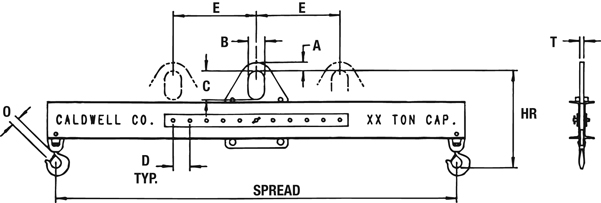 Model Number | Capacity (tons) | Spread (ft) | A (in.) | B (in.) | C (in.) | T (in.) | O (in.) | D (in.) | E (in.) | HR (in.) | Weight (lbs.) |