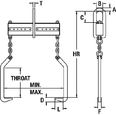 Model Number | Capacity (tons) | Min Coil Width (in.) | Max Coil Width (in.) | Throat (in.) | HR (in.) | A (in.) | B (in.) | C (in.) | T (in.) | D (in.) | F (in.) | L (in.) | Weight (lbs) |