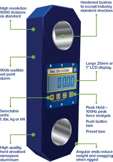 Known worldwide as the original electronic force measurement device to feature an integral display, the Loadlink plus has been in production since 1979. Over the years, the line has been expanded and it is now used on a daily basis for load monitoring and heavy lifts. These can range in capacity from 1t to 300t, and are used by a variety of industrial and commercial industries including manufacturing, transportation, agriculture, oil and gas, utilities, aerospace and clean energy.