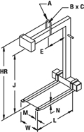 Model Number | Capacity (tons) | L | M | N | W - Min. | W - Max. | E | A | B | C | J* | HR | Weight (lbs) |