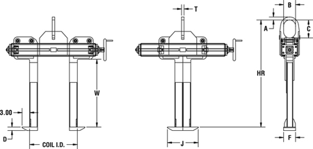 Model Number | Capacity (tons) | Min Coil ID (in.) | Max Coil ID (in.) | W (in.) | HR (in.) | A (in.) | B (in.) | C (in.) | T (in.) | F (in.) | D (in.) | J (in.) | Weight (lbs) |