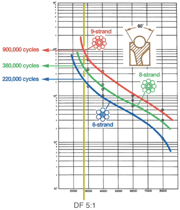 Courbure et résistance à la fatigueLa capacité d’un câble d’acier de supporter des répétitions de courbure sur les poulies et sur les tambours est appelée “résistance à la fatigue”. Ce terme décrit l’ultime durée de vie d’un câble basée sur la résistance mécanique a la fatigue maximale. Ce terme ne décrit PAS la capacité du câble de supporter des dommages mécaniques ou la résistance au facteur d’ecrasement du câble. La résistance à la fatigue d’un câble ne dépend pas de la durée de travail mais bien du cycle de travail. La fatigue due à la courbure est la capacité de supporter une courbe répétitive sur les poulies et les tambours et cette capacité est reliée aux factures d’équipements suivants: le diamètre, la forme, et les dimensions des gorges des poulies et des tambours : la charge à laquelle le câble est assujetti : la vitesse de ligne : une accélération rapide et les forces de freinage: la construction du câble. Plus le rayon de courbure s’accroît plus on peut s’attendre une longueur de vie accrue. De grands tambours et de grandes poulies vont réduire les pressions radiales du câble. Les courbures a sens inverse dans le système d’enroulement, particulièrement dans de courtes distances auront un impact négatif sur la vie du câble. |