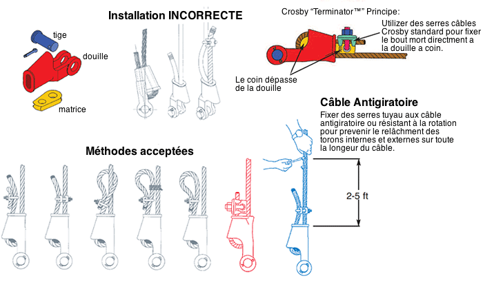 - Lorsque vous utilisez des câbles 34×7 ainsi que tous les câbles Python® antigiratoires, attachez une pince à environ 3-5 pieds au-dessus de la douille AU BRIN VIVANT du câble AVANT D’ATTACHER LA DOUILLE. La pince va empêcher le mou des torons extérieurs, qui aurait pu survenir tout le long du câble pendant l’installation. Si cela se produit, vous devez légèrement raccourcir le câble mais vous aurez limité les dégâts à une très courte portion du câble.