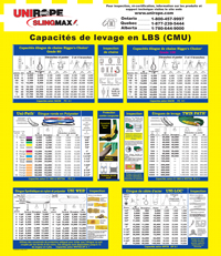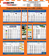 Notez que les élingues en chaîne avec un FC de 4:1 sont spécifiées dans ASME B30.9, ASTM A 952, NACM 2010, EN 818-4, l’OSHA section des États-Unis et toutes les autres lois provinciales sur la santé et la sécurité au Canada (à l’exception du secteur de la construction en Ontario, tel qu’il est indiqué ci-dessous). Ontario:La raison pour laquelle une deuxième charte classant les élingues en chaîne avec un FC de 5:1 est justifiée par le fait qu’en Ontario, la LSST pour les projets de construction l’exige. TOUTES les autres industries et applications sont classées avec un FC de 4:1. Québec:La raison pour laquelle une deuxième charte de capacité pour les élingues de chaine avec un facteur de conception (FC) de 5:1 est requise, est due au fait qu’au Québec le manuel « Gréage et Levage » pour les projets de construction l’exige. TOUTES les autres industries et applications sont classées avec un FC de 4:1. Besoin de conseil ? Appelez-nous. Pour les versions imprimées GRATUITES du tableau mural de capacité FC 4:1 et /ou FC 5:1 (de grandeur 46 po x 48 po), veuillez nous appelez où parler à votre consultant en gréage Unirope® local. |