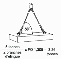 Une charge de 5 tonnes doit être soulevée avec une élingue dotée d’une bride à branche double. L’angle de l’élingue par rapport à l’horizontale est de 50˚, les branches des élingues sont d’égales longueurs, et le centre de gravité est au centre de la charge (si ce n’est pas le cas, consultez la Centre de Gravité).
