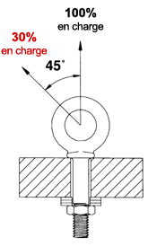 À un angle de levage de 45°, les pitons à œil supportent seulement 30 % de leur capacité nominale VERTICALE. Une élingue (de n’importe quel type) utilisée au même angle de 45° supporte 71 % de sa capacité verticale. |