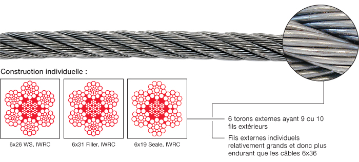 Rendez-vous compte : les 6x26 sont groupés sous la classe 6x19, tandis que les 6x31 sont groupés sous la classe 6x37 toutefois tous deux ont 10 fils extérieurs et ne distinguent pas par leur apparence extérieure.