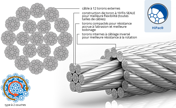 Le procédé de compactage HiPac™ crée une surface extérieure lisse, ce qui a démontré une grande amélioration lorsque utilisé sur des tambours multicouches. La surface du câble extrêmement lisse fait en sorte que ces câbles glissent les uns contre les autres en s’enroulant dans la couche suivante du tambour; l’entrecroisement, le “grincement” subséquent ainsi que les défaillances mécaniques entre les torons s’en trouvent grandement réduits.