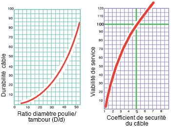 Courbure et résistance à la fatigueLa capacité d’un câble d’acier de supporter des répétitions de courbure sur les poulies et sur les tambours est appelée “résistance à la fatigue”. Ce terme décrit l’ultime durée de vie d’un câble basée sur la résistance mécanique à la fatigue maximale. Ce terme ne décrit PAS la capacité du câble de supporter des dommages mécaniques ou la résistance au facteur d’écrasement du câble. La résistance à la fatigue d’un câble ne dépend pas de la durée de travail mais bien du cycle de travail. La fatigue due à la courbure est la capacité de supporter une courbe répétitive sur les poulies et les tambours et cette capacité est reliée aux facteurs d’équipements suivants: • Le diamètre, la forme, et les dimensions des gorges des poulies et des tambours Plus le rayon de courbure s’accroît plus on peut s’attendre une longueur de vie accrue. De grands tambours et de grandes poulies vont réduire les pressions radiales du câble. Les courbures à sens inverse dans le système d’enroulement, particulièrement dans de courtes distances auront un impact négatif sur la vie du câble. |