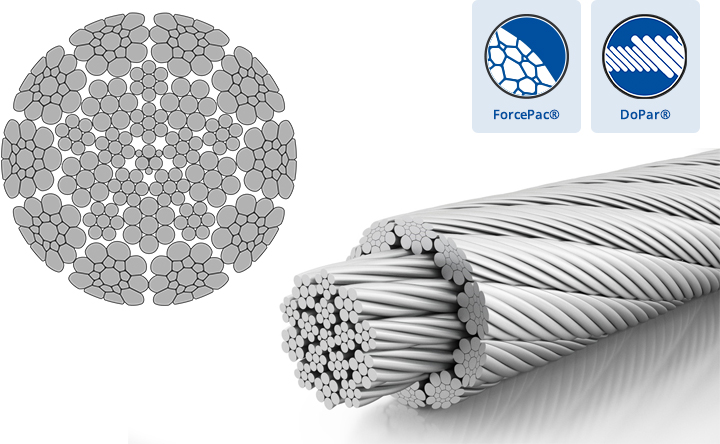 Câble d’acier à résistance ultra élevée utilisé principalement pour les assemblages techniques de câbles, les câbles contrepoids, les câbles de treuil, les tirants de flèche d’extension et de rétraction, etc. Les ponts roulants de taille dépassant 3/4″ (19 mm) pourraient exiger quelques restrictions quant aux angles d’attaque et quant à la direction du câblage.