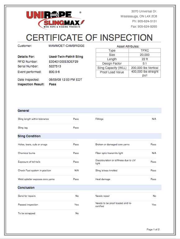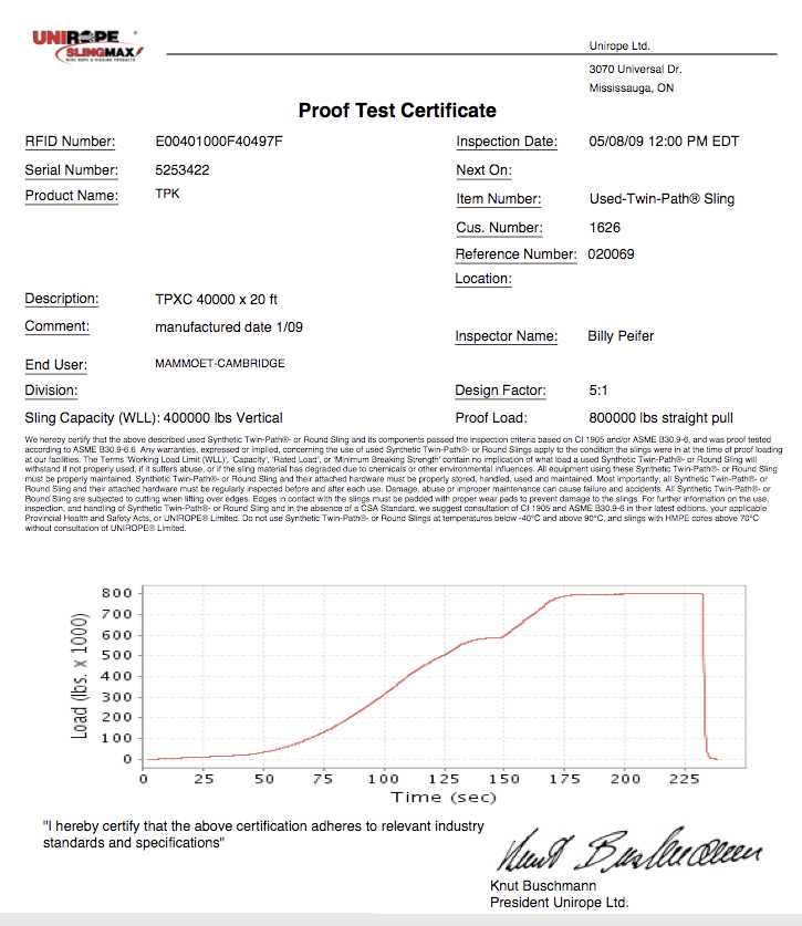 Ceci est notre certificat d’essai de tension et il n’est émis que si l’élingue ou l’équipement de levage a réellement réussi un essai de tension, soit grâce à nos unités mobiles, soit grâce à nos équipements d’essai à nos installations. Le graphique affiché est automatiquement généré par notre banc d’essai et envoyé par Internet au serveur qui le joint au certificat d’essai généré par le système RFID de Uniropeᴹᴰ.