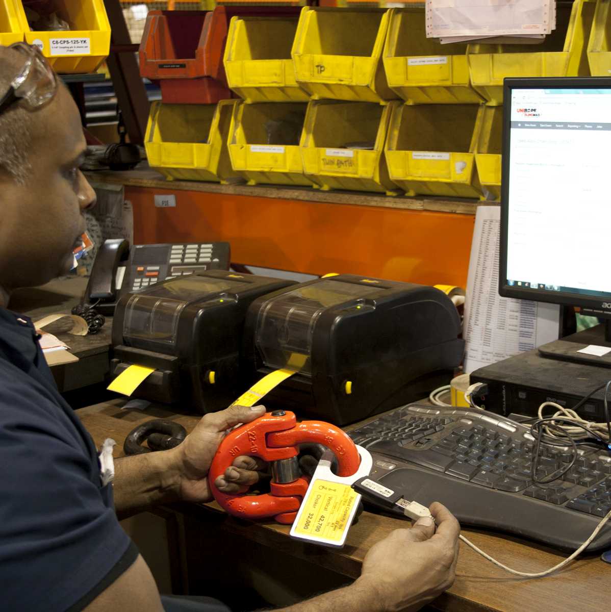 La lecture d’une étiquette de chaîne de levage avec une puce RFID intégrée donne accès à toute l’information sur le produit et la sécurité, ainsi qu’à l’historique des inspections passées.