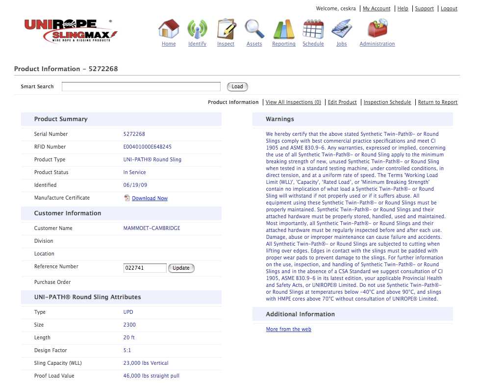 Lorsque vous êtes connecté, vous pouvez faire une recherche sur nombre de critères. Si vous avez utilisé un lecteur RFID, celui-ci vous dirigera directement à votre produit de levage spécifique. Si vous n’utilisez pas un lecteur, vous pouvez faire une recherche par numéro d’identification d’élingue, numéro de série, numéro d’identification de la dernière inspection, type de produit, etc.