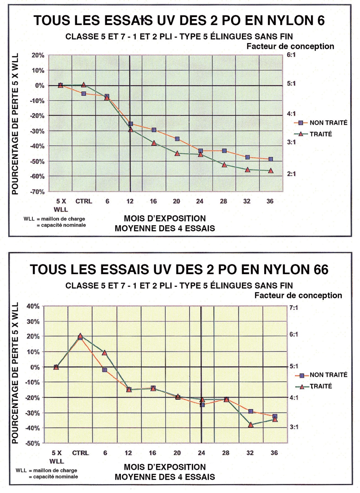 « Les échantillons de polyester tendent à subir la plus grande partie de leur perte de résistance pendant les douze premiers mois de l’exposition pour ensuite se stabiliser à environ 30 % de perte en résistance. Les échantillons nylon 6 et nylon 6.6 ont montré une tendance générale de perte de résistance continue sur toute la période d’exposition de 36 mois, avec des niveaux de perte de résistance approchant cinquante à soixante pourcent après 36 mois pour certains échantillons d’essai.