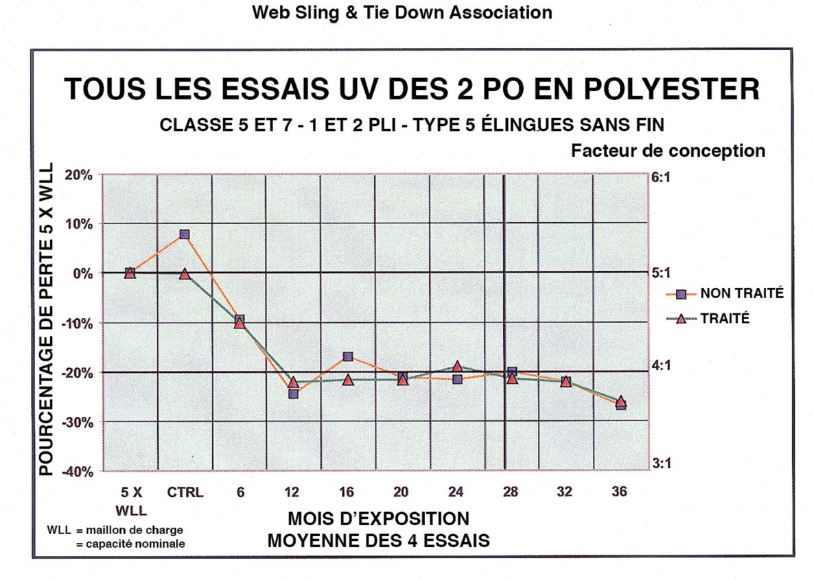 L’association « Web Sling and Tie-Down Association (WSTDA) » a mené deux études expérimentales à long terme sur la dégradation du polyester- comparativement à celle des élingues en sangle de nylon lorsque exposés à la lumière du soleil. La première étude a été complétée en 1981, et la série d’essais de la seconde étude ont été réalisés entre 1997 et 2004. Le rapport complet sur les essais a été publié par la WSTDA; une copie peut en être obtenue de Unirope.