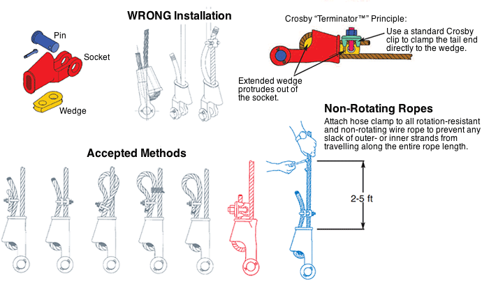End terminations with wedge sockets are most popular with tower and mobile cranes although they do not generate as high as an strength efficiency rating as swaged sleeves, swaged sockets, or spelter sockets.