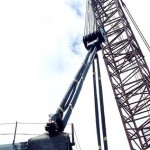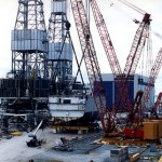 - Ship yard site with Manitowac Ringer Cranes having one ship section on the hook. Both cranes swing to the inside, time delayed to turn the section to fit between the cranes, and then lower them into the dry dock.