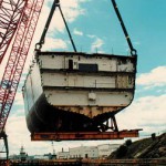 Twin-Path® Synthetic Slings Lifting an 800 ton ship at the St John Shipyard, in St. John NB, Canada. A series of frigates were built in modular style, this means that each frigate was built in 3 sections in a large "under roof" shipyard. There have been greater single lifts done using Twin-Path® slings, eg. a single reactor lift, however, the slings for the Frigate program, over a long period of time, performed over 50 lifts in a harsh industrial environment. We at Unirope Ltd., still regard these multiple lifts as the "WORLD RECORD HOLDER" for synthetic lifting slings. |